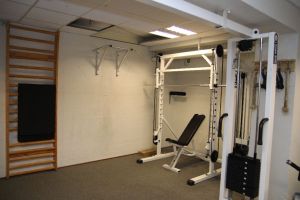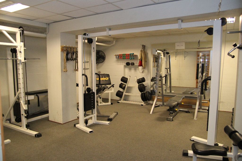 Styrketræningsrummet har en lang række dumbbells, to bænkpres og en række maskiner, som alle kan ses på billederne.