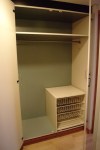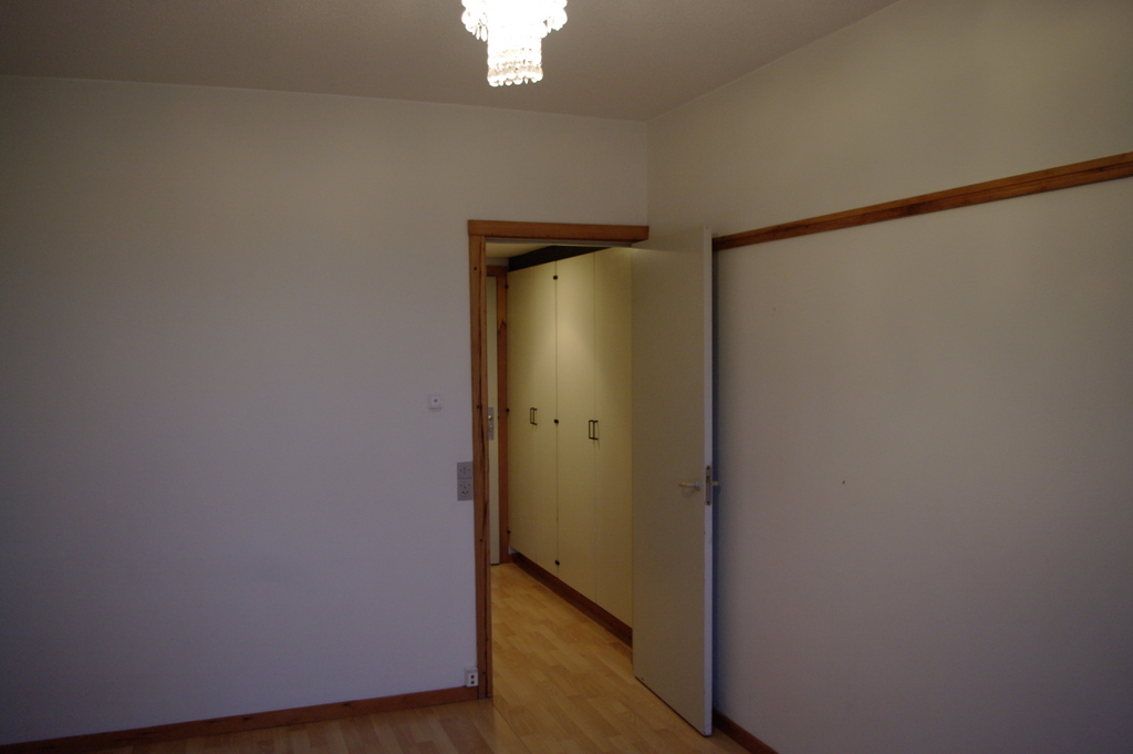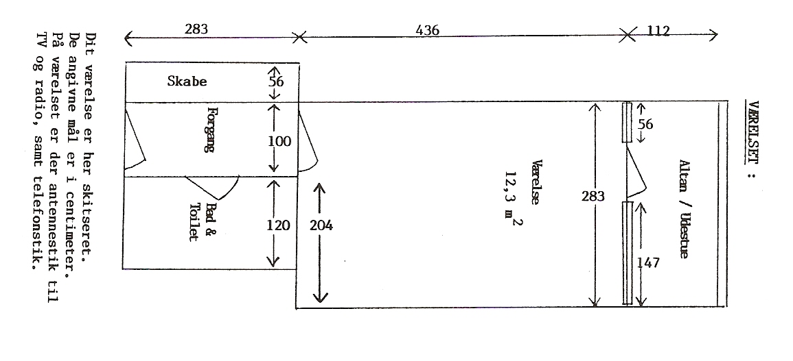 Selve værelset er 12 kvm, og dertil hører badeværelset, mellemgang med masser af skabsplads og altanen. Badeværelset har en stor brusekabine, så man ikke skal i bad over vasken.